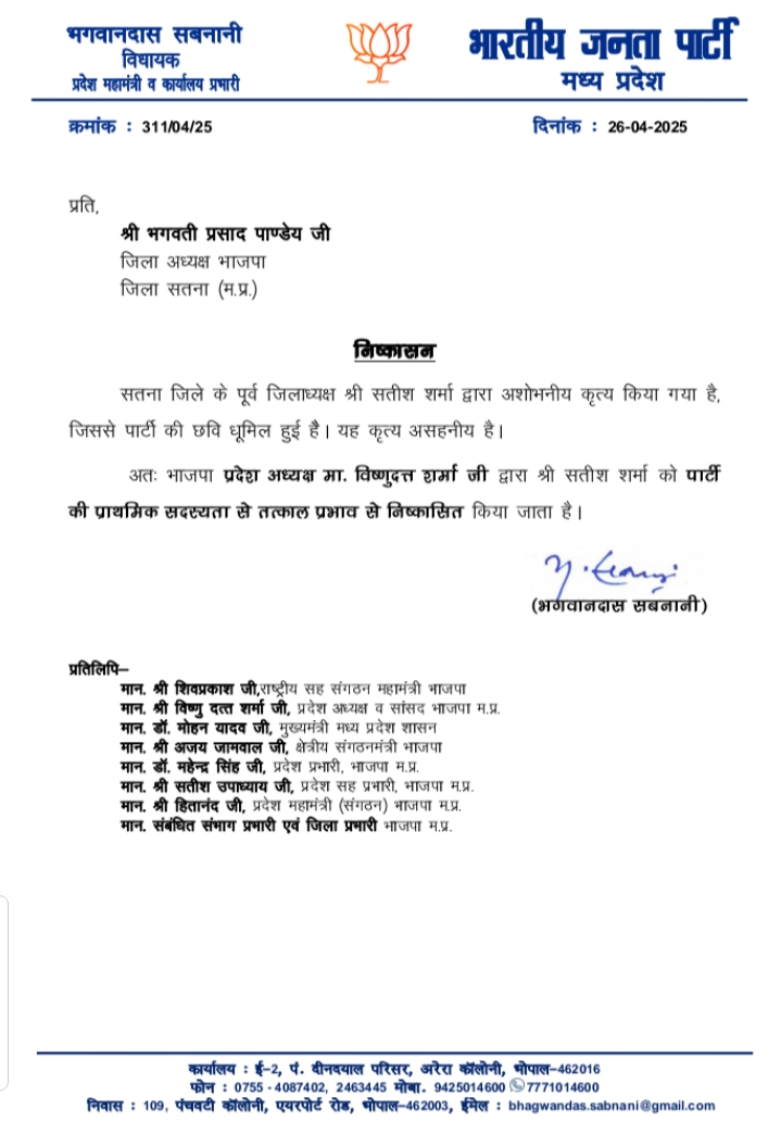 भोपाल : मध्य प्रदेश भाजपा के प्रदेश अध्यक्ष वीडी शर्मा ने सतना के पूर्व जिलाध्यक्ष सतीश शर्मा को पार्टी से निष्कासित कर दिया है। सतीश पर हाल ही में एक महिला ने छेड़खानी करने, अश्लील चैट और जान से मारने की धमकी देने के गम्भीर आरोप लगाते हुए केस दर्ज करवाया है। जिस वजह से पार्टी की छवी ख़राब हो रही थी। जिसको देखते हुए वीडी शर्मा ने यह कदम उठाया।