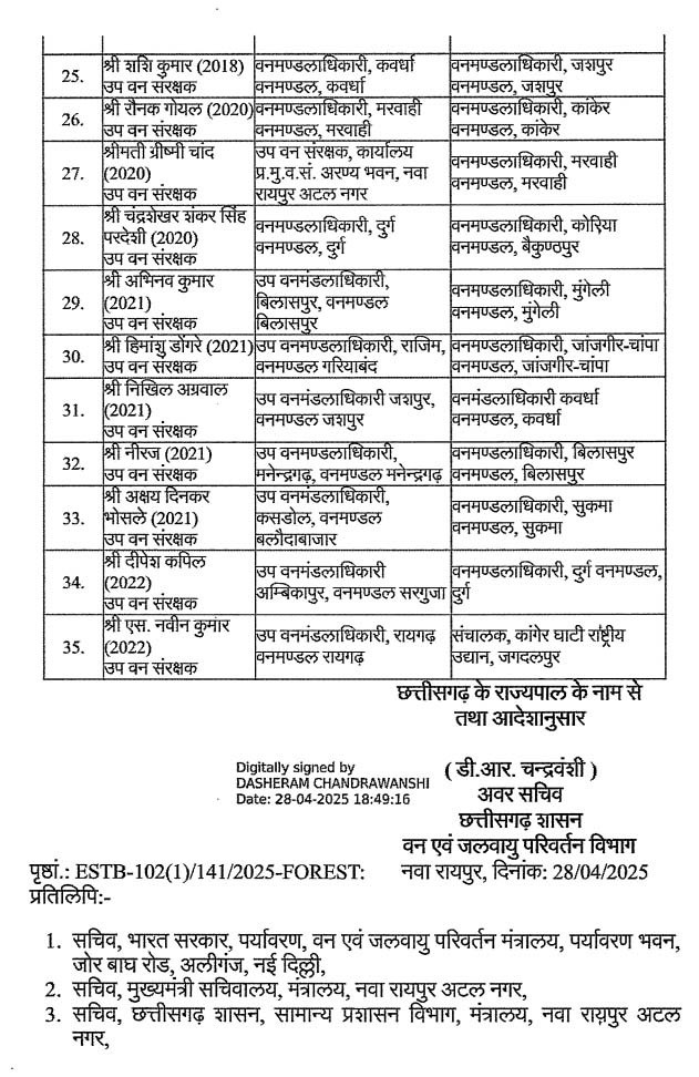 रायपुर। छत्तीसगढ़ में वन विभाग की टीम ने बड़ी संख्या में अधिकारियों का तबादला किया है। दरअसल वन और जलवायु परिवर्तन विभाग ने 35 अधिकारियों के ट्रांसफर के आदेश जारी किए हैं। जिसके तहत बलरामपुर और खैरागढ़ के भी डीएफओ को बदला गया है। इसके अलावा कई सहायक वन संरक्षक और IFS के नाम भी इसमें शामिल है।