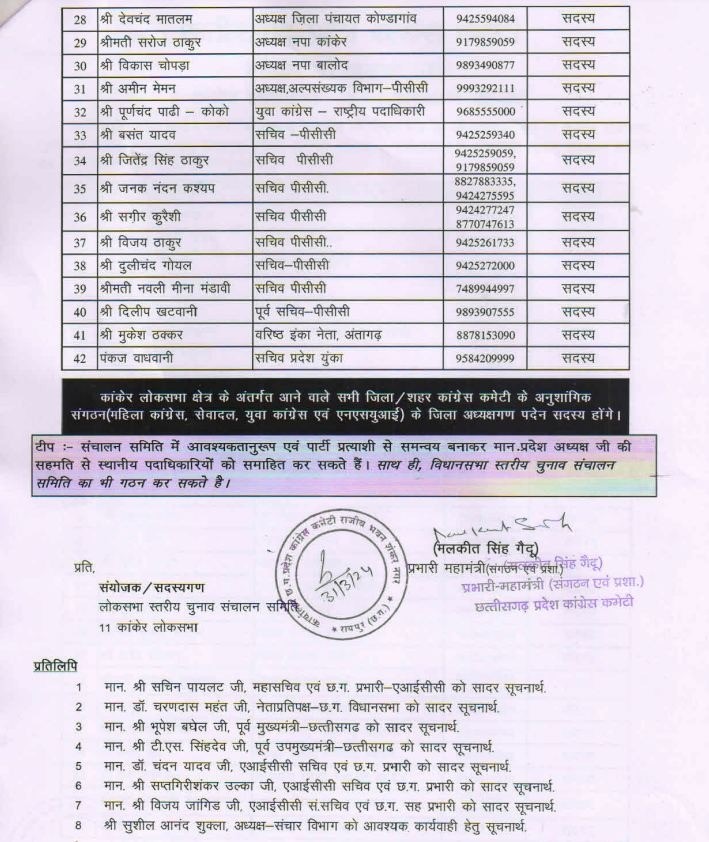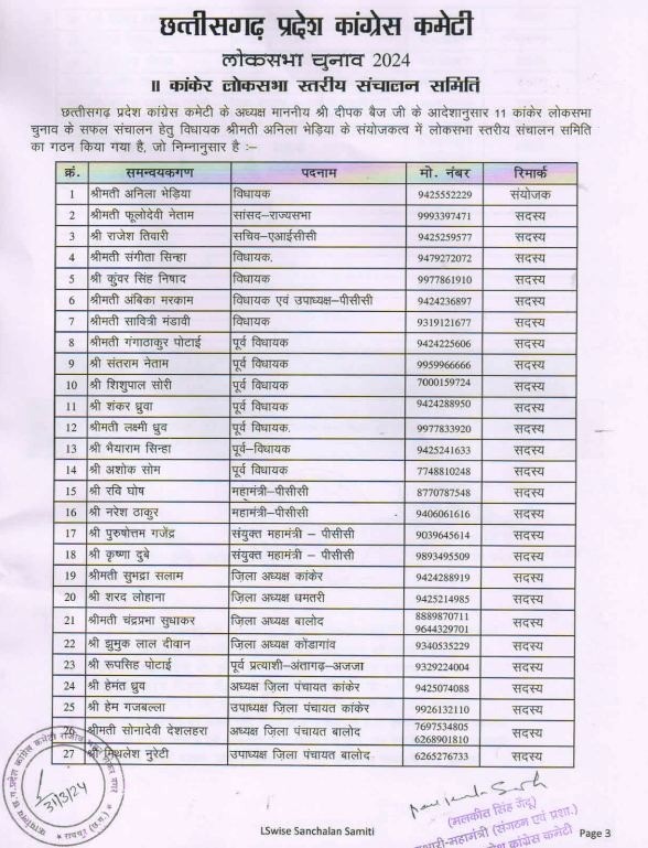 कांकेर।Lok Sabha Election 2024: छत्तीसगढ़ में कांग्रेस पार्टी के द्वारा आज कांकेर लोकसभा के सन्दर्भ में एक नई समिति तैयार की गई है. जिसमें कांग्रेस विधायक अनीला भेड़िया को इस दौरान समिति संयोजक के रूप में नियुक्त किए गए हैं. बता दें इस समिति में लगभग 42 नेताओं इस समिति में जगह दी जाएगी। इसे साथ ही समिति कांकेर जिले के अलग अलग विधानसभा क्षेत्रों के सभी नेताओं को इसमें शामिल किए जाएंगे। इसके अलावा यहां पर लोकसभा चुनाव के सन्दर्भ आज बीरेश ठाकुर के पक्ष में इस दौरान प्रचार प्रसार करेगी। साथ ही इसकी बैठकें कर इनके पक्ष में वोट शेयर कर टीम बढ़ाने का भी काम करेगी.