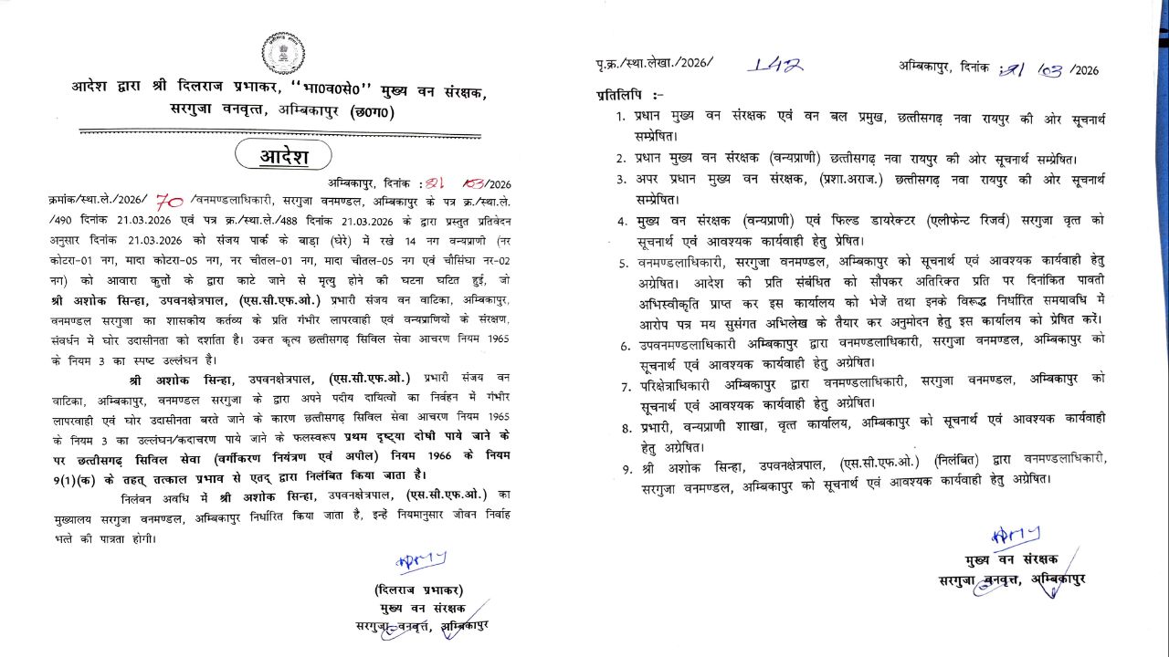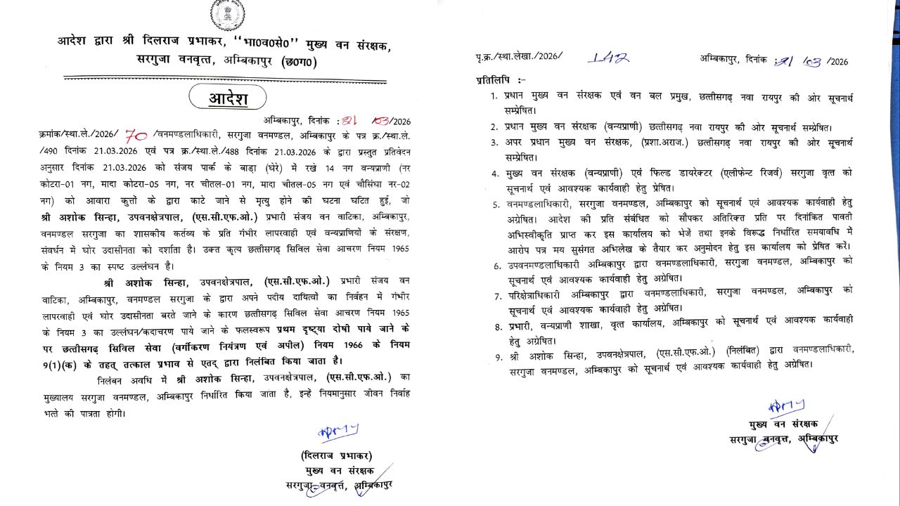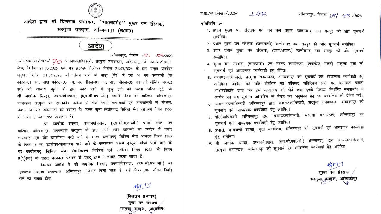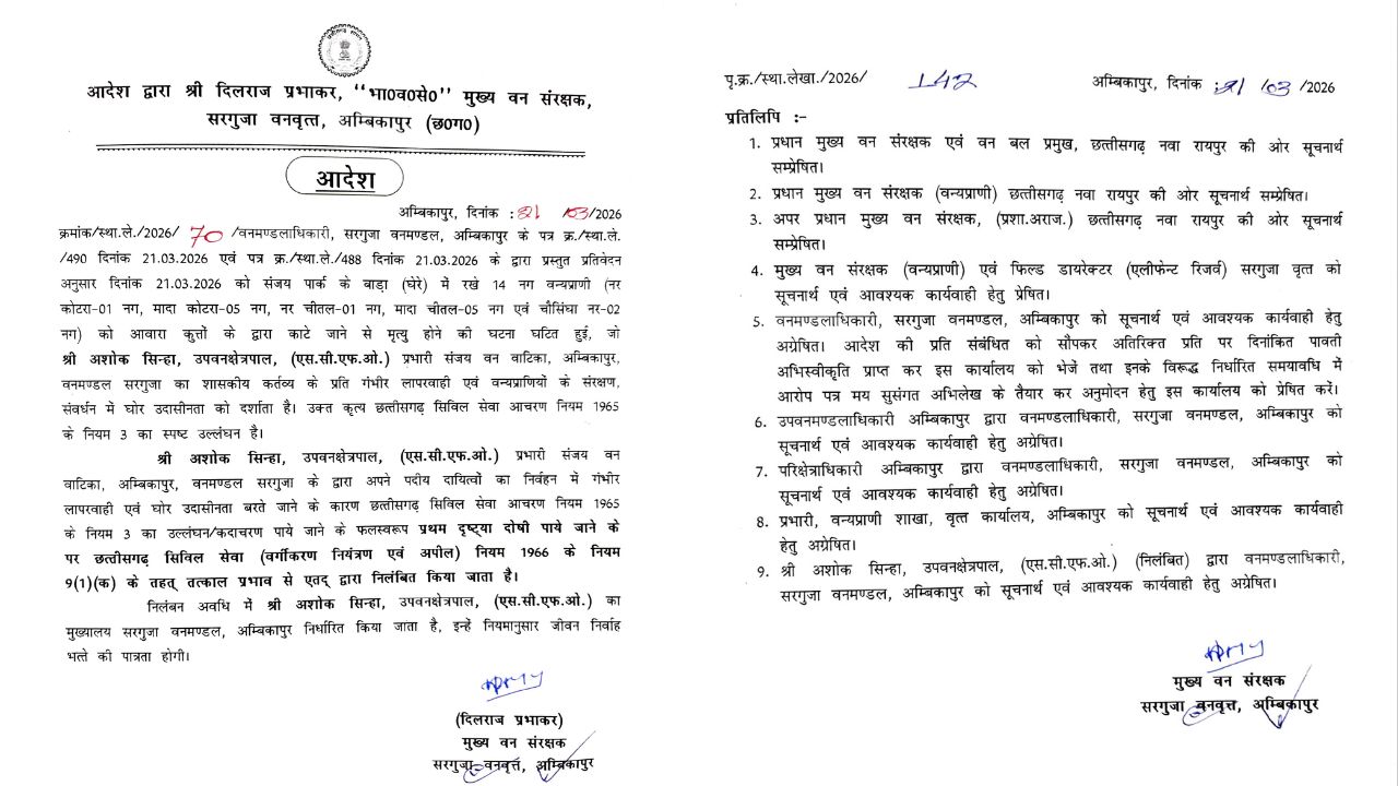 • अंबिकापुर संजय पार्क में 15 हिरणों की मौत: DFO ने डिप्टी रेंजर समेत चार निलंबित, शव जलाने का आरोप...