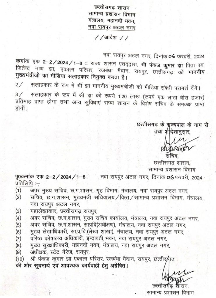 • CM Vishnu Dev Sai : सीएम साय के मीडिया सलाहकार बने पंकज कुमार झा, सामान्य प्रशासन ने जारी किया नियुक्त के आदेश