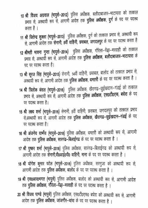 इसके साथ ही IPS आजाद शत्रु बहादुर को डीआईजी इंटेलिजेंस, एसआईबी में आईपीएस अंकित गर्ग को आईजी नियुक्त किया गया। वहीं सरगुजा एसपी की जिम्मेदारी आईपीएस राजेश अग्रवाल को दी गई है। वहीं पुलिस अधीक्षक बलोदा बाजार की जिम्मेदारी आईपीएस भावना गुप्ता को मिली है। और दुर्ग एसपी के पोस्ट पर विजय अग्रवाल को नियुक्त किया गया।