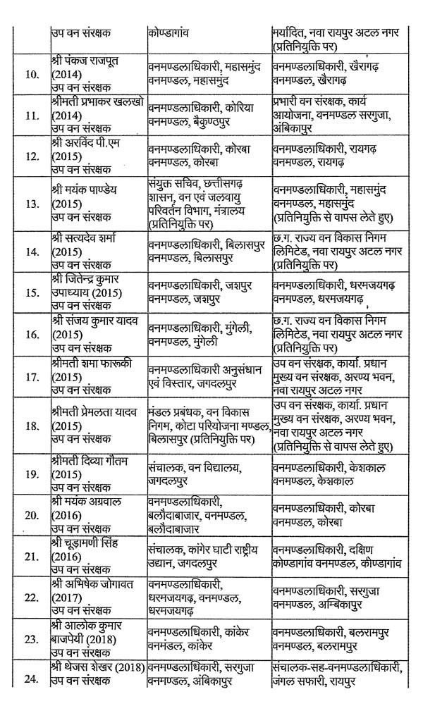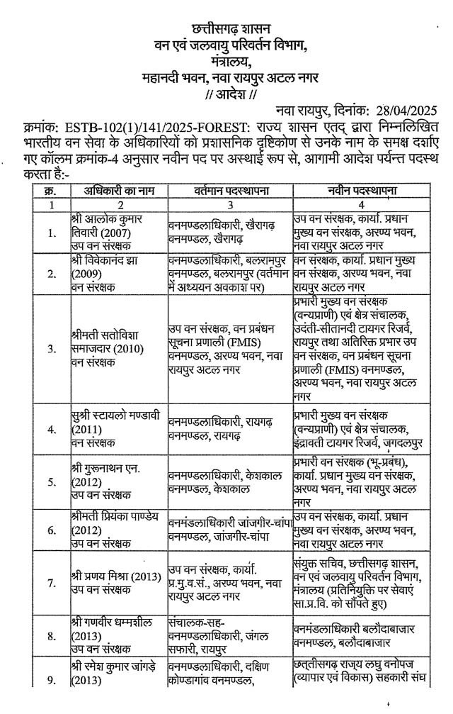 रायपुर। छत्तीसगढ़ में वन विभाग की टीम ने बड़ी संख्या में अधिकारियों का तबादला किया है। दरअसल वन और जलवायु परिवर्तन विभाग ने 35 अधिकारियों के ट्रांसफर के आदेश जारी किए हैं। जिसके तहत बलरामपुर और खैरागढ़ के भी डीएफओ को बदला गया है। इसके अलावा कई सहायक वन संरक्षक और IFS के नाम भी इसमें शामिल है।
