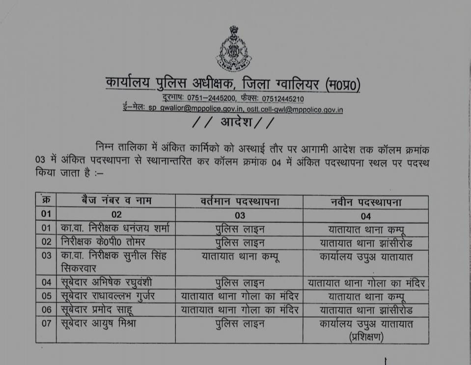 ग्वालियर : मध्य प्रदेश में इन दिनों तबादले का दौर जारी है। आए दिन प्रशासन द्वारा अलग अलग विभाग के तबादले के आदेश जारी किये जा रहे है। इसी कड़ी में बीते दिन ग्वालियर पुलिस विभाग में 22 अधिकारियों सहित इंस्पेक्टर के ट्रांसफर किये गए। जिसका आदेश एसएसपी धर्मवीर सिंह ने जारी किए। इसके साथ ही एसएसपी धर्मवीर सिंह ने शहर की ट्रैफिक व्यवस्था सुधार के लिए ट्रैफिक प्रभारीयो को भी इधर से उधर किया है।