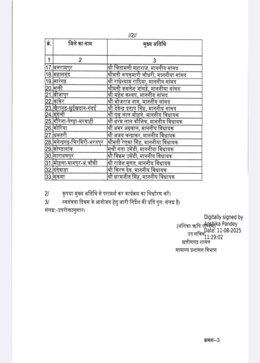 साथ ही गरियाबंद में मंत्री दयालदास बघेल, बालोद में मंत्री केदार कश्यप, कोरबा में मंत्री लखन देवांगन, रायगढ़ में मंत्री ओपी चौधरी ध्वजारोहण करेंगे. सूरजपुर में मंत्री लक्ष्मी राजवाड़े, मंत्री टंकराम वर्मा जांजगीर-चांपा में ध्वजारोहण करेंगे बलौदाबाजार में सांसद बृजमोहन अग्रवाल, बेमेतरा में सांसद विजय बघेल ध्वजारोहण करेंगे, और कवर्धा में सांसद संतोष पांडे ध्वजारोहण करेंगे.