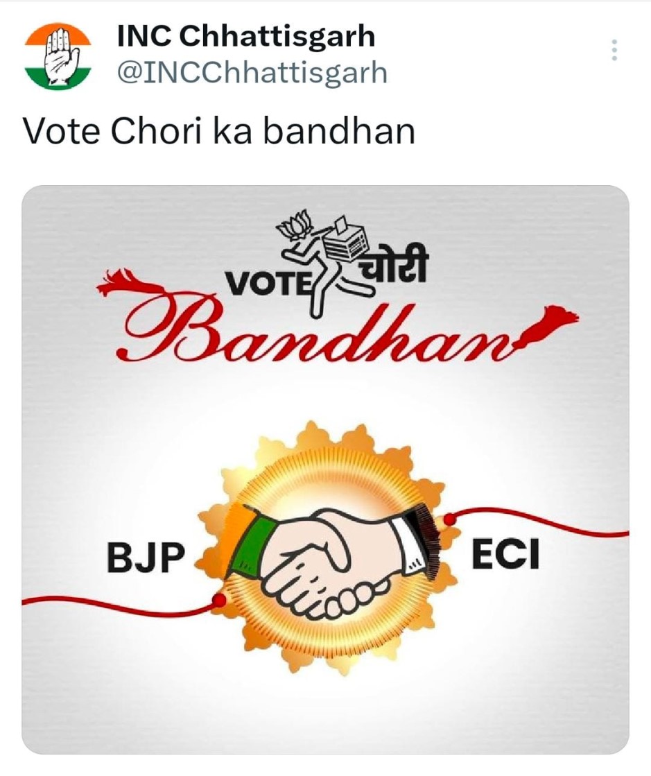 रायपुर: छत्तीसगढ़ के राजधानी रायपुर में रक्षाबंधन त्योहार के जरिए वोट चोरी के आरोप वाली सियासत शुरू हो गई है. दरअसल छत्तीसगढ़ कांग्रेस ने BJP और ECI का हाथ मिलाते हुए एक पोस्ट शेयर किया है. इस पोस्ट के जरिए कांग्रेस ने भाजपा पर तंज कसते हुए X में पोस्ट क लिखा कि वोट चोरी का बंधन है, जिस पर छत्तीसगढ़ कांग्रेस के पोस्ट पर मुख्यमंत्री के मीडिया सलाहकार पंकज झा ने पलटवार किया है उन्होंने झा ने लिखा कि, कांग्रेस के सोशल मीडिया हैंडलर्स अब किसी भी आतंकी हैंडलर्स से अधिक खतरनाक होते जा रहे हैं.