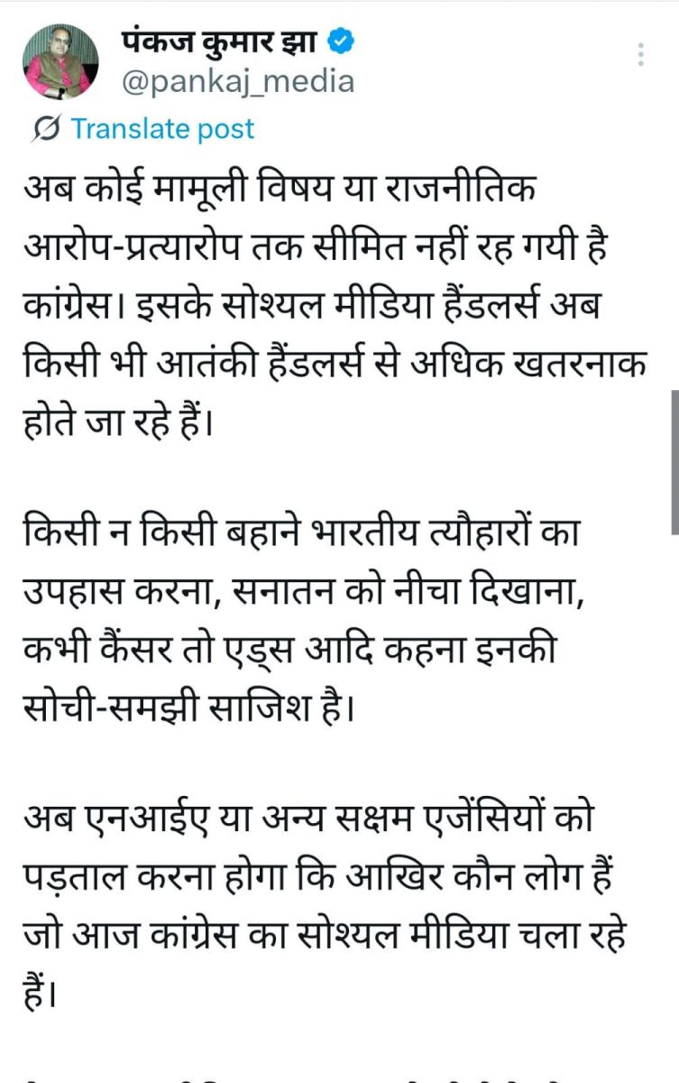 किसी न किसी बहाने भारतीय त्यौहारों का उपहास करना, सनातन को नीचा दिखाना, कभी कैंसर तो एड्स आदि कहना इनकी सोची-समझी साजिश है. अब एनआईए या अन्य सक्षम एजेंसियों को पड़ताल करना होगा कि आखिर कौन लोग हैं जो आज कांग्रेस का सोशल मीडिया चला रहे है.