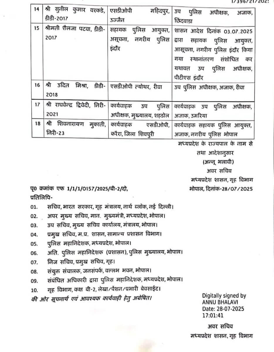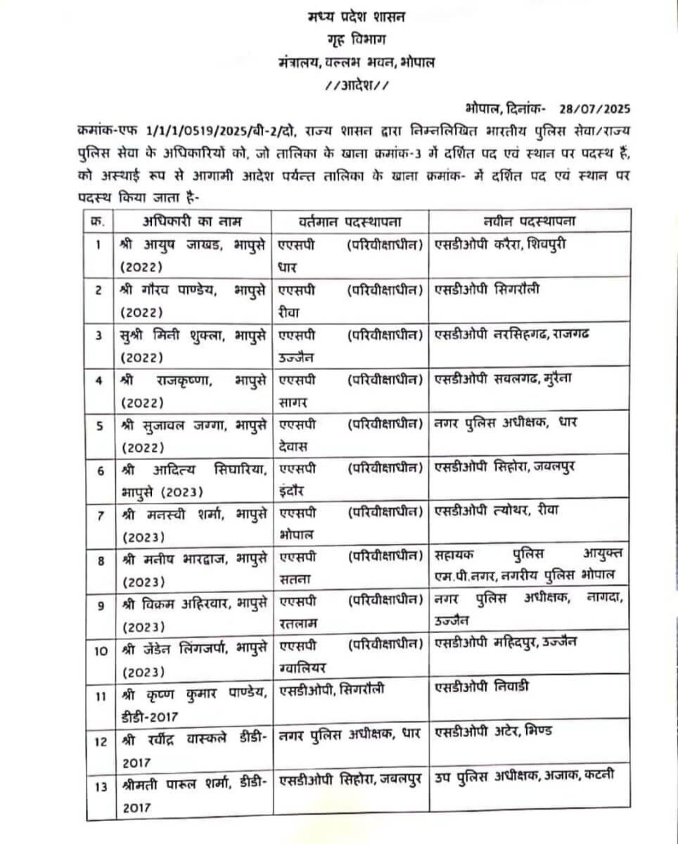 भोपाल : मध्य प्रदेश पुलिस विभाग में आज बड़ा फेरबदल होने के चलते 18 अधिकारियों को इधर से उधर कर दिया गया है। इसमें 10 आईपीएस और 8 DSP स्तर के अधिकारियों के नाम शामिल है। जिसको लेकर गृह विभाग ने आदेश भी जारी कर दिया। ये अधिकारी वर्तमान में कहीं एसडीओपी, कहीं नगर पुलिस अधीक्षक, कहीं डीएसपी, कहीं कार्यवाहक उप पुलिस अधीक्षक का दायित्व संभाल रहे हैं।