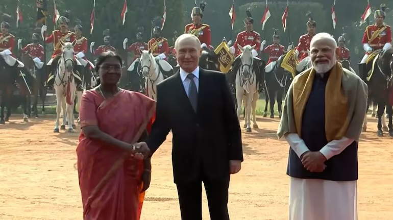 Putin India Visit: रूस के राष्ट्रपति व्लादिमीर पुतिन का शुक्रवार सुबह दिल्ली पहुँचने पर राष्ट्रपति भवन में पारंपरिक सम्मान के साथ स्वागत किया गया। उनके आगमन पर ‘गार्ड ऑफ ऑनर’ की औपचारिकता पूरी की गई। राष्ट्रपति द्रौपदी मुर्मू और प्रधानमंत्री नरेंद्र मोदी ने पुतिन का अभिवादन किया और आधिकारिक समारोह में शामिल हुए।