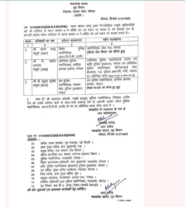 तो वही दूसरा नाम मोहम्मद शाहिद अबसार का है। जिन्हे अतिरिक्त पुलिस महानिदेशक (एडीजी) चयन एवं भर्ती, पुलिस प्रशिक्षण अनुसंधान संस्थान (पीटीआरआई), और संचालक पुलिस अकादमी भौंरी की जिम्मेदारी सौंपी गई है। इसके अलावा, मोहम्मद यूसुफ कुरैशी को आर्थिक अपराध प्रकोष्ठ (EOW) में पुलिस उपमहानिरीक्षक (DIG) बनाया गया है।