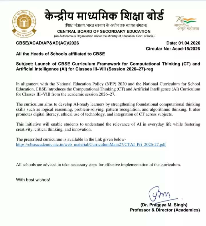 केंद्रीय माध्यमिक शिक्षा बोर्ड (CBSE) ने स्कूली शिक्षा में बड़ा बदलाव करते हुए कक्षा 3 से 8 तक आर्टिफिशियल इंटेलिजेंस (AI) और कम्प्यूटेशनल थिंकिंग (CT) को अनिवार्य करने का फैसला लिया है। यह नया पाठ्यक्रम शैक्षणिक सत्र 2026-27 से लागू किया जाएगा और इसे राष्ट्रीय शिक्षा नीति (NEP 2020) के अनुरूप तैयार किया गया है।