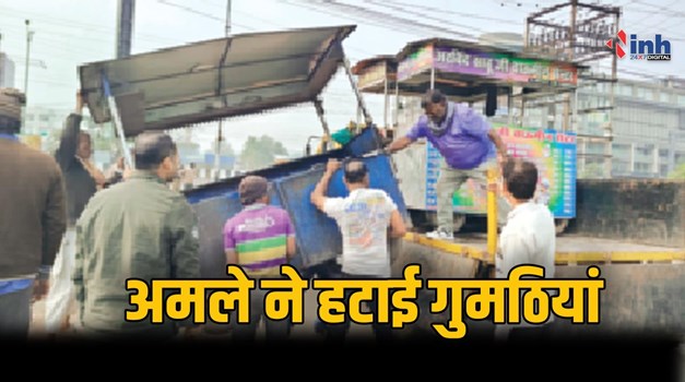 अमले ने हटाई गुमठियां, अवैध छप्पर 33 ठेले सहित 14 ट्रक सामान जब्त
