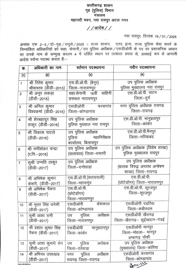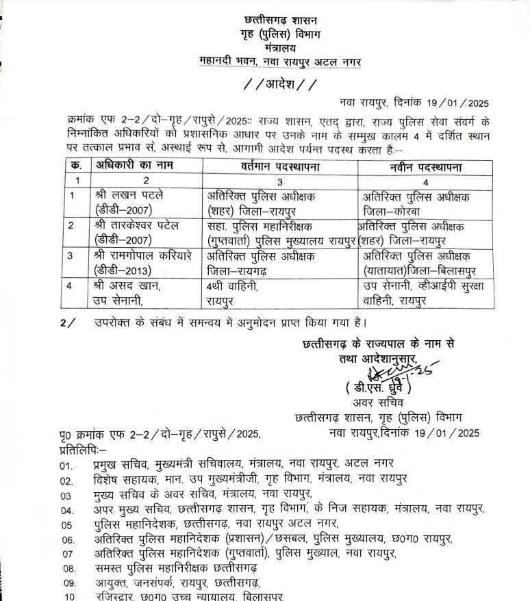 राज्य शासन के द्वारा जारी किए गए आदेश के मुताबिकतार केश्वर पटेल एआईजी पीएचक्यू से एएसपी सिटी, लखन पटले एएसपी रायपुर से कोरबा, असद खान उपसेनानी चौथी बटालियन से वीआईपी सुरक्षा। रामगोपाल करियारे एएसपी रायगढ़ से एएसपी ट्रैफिक बिलासपुर, अनामिका जैनरायगढ़ से पीएचक्यू, डीएसपी एवं सहायक सेनानी में वीरेंद्र चतुर्वेदी को पीएचक्यू से विधानसभा थाना एसडीओपी, निशीथ अग्रवाल मुख्यालय से साइबर थाना, राजू गुप्ता मुख्यालय से पुलिस मुख्यालय 11वीं वाहिनी जांजगीर, पूर्णिमा लांबा डायल 112 से सीएसपी उरला, सुशांतो बनर्जी रायपुर से रायगढ़, योगेश साहू कोतवाली से डायल 112, केशरीनंद नायक विधानसभा से सीएसपी कोतवाली, दीपक भगत नारायणपुर से नवा रायपुर, राजेश शर्मा 9वीं बटालियन से मंत्रालय सुरक्षा, त्रिभुवन मोहन वासूनिक 21वीं छसबल से 9वीं वाहिनी भेजा गया और अविनाश कंबर विशेष शाखा से एसडीओपी बेनूर की जिम्मेदारी दी गई है।