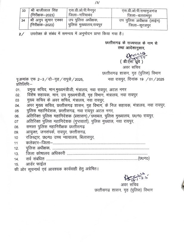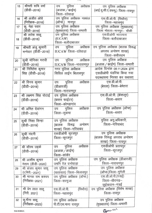 इसके आलावा अनिल विश्वकर्मा फरसगांव से रायगढ़, विकास पाटले बिलासपुर से गरियाबंद,रितेश श्रीवास्तव बेनूर नारायपुर से नवा रायपुर अनूप लकड़ा 16वीं वाहिनी से एसडीओपी पाटन, मणिशंकर चंद्रा धमतरी से विशेष शाखा रायपुर, अभिषेक पैकरा छोटेडोंगर से सूरजपुर, उन्नति ठाकुर दंतेवाड़ा से रायगढ़, शेर बहादुर सिंह नवा रायपुर से कांकेर, आशा सेन दंतेवाड़ा से कोरिया, अभिषेक केशरी सरायपाली से छोटेडोंगर, आशारानी नारायणपुर से खैरागढ़- छुईखदान, प्रशांत सिंह भानुप्रतापपुर से मानपुर अभिनव उपाध्याय रायगढ़ से कोंडागांव, भूपत सिंह कोंडागांव से कबीरधाम, रुचि वर्मा दंतेवाड़ा से रायपुर भेजे गए हैं। नेहा पवार धमतरी से मोहला मानपुर, मोनिका मरावी नारायणपुर से धमतरी, निशा सिंह बाल अपराध अन्वेषण से गरियाबंद एसडीओपी, तारेश साहू आईयूसीएडब्लू से भाठापारा, अजीत ओगरे मानपुर से महासमुंद, अंजू मन्नेवार दंतेवाड़ा से कबीरधाम, विनय कुमार नारायणपुर से बेमेतरा, लक्ष्मण सिंह कोंडागांव से बस्तर, अनूप एक्का पीएचक्यू से सूरजपुर, अमित सिंह सुकमा से बस्तर, सौरभ उइके कांकेर से सूरजपुर, नंदिनी सूरजपुर से रायपुर, संजय साहू बिलासपुर से मुंगेली, बाजीलाल सिंह गरियाबंद से बलरामपुर, मानकराम सरगुजा से खैरागढ़, आशीष नेताम दंतेवाड़ा से नारायणपुर, मीना साहू रायपुर से धमतरी भेजे गए हैं।