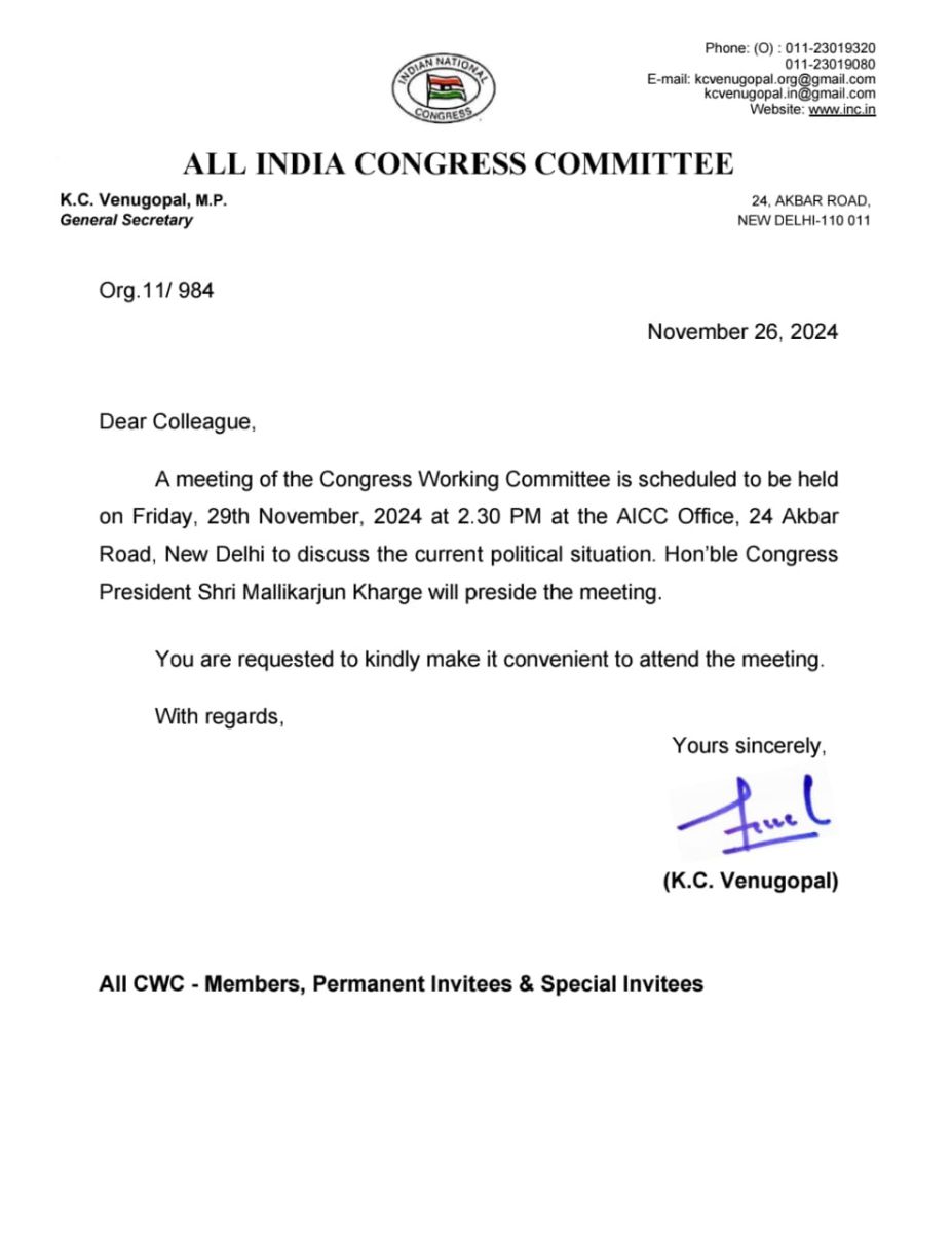 दिल्ली: कांग्रेस कार्यसमिति (CWC) की बड़ी बैठक आयोजित की है, बैठक 29 नवम्बर को रखी है। दोपहर 2.30 बजे रखे गए इस बैठक में महाराष्ट्र, हरियाणा, की हार समेत वर्तमान राजनैतिक हालातों पर चर्चा की जाएगी।