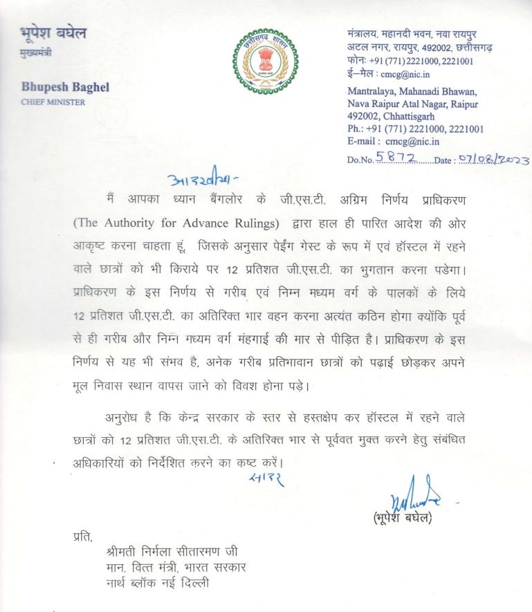 Big news: छत्तीसगढ़ के मुख्यमंत्री भूपेश बघेल ने आज केंद्रीय वित्त मंत्री निर्मला सीतारमण को खत लिखा है। उन्होंने 12% जीएसटी के अतिरिक्त भार से छात्रों को मुक्त करने का आग्रह किया है।