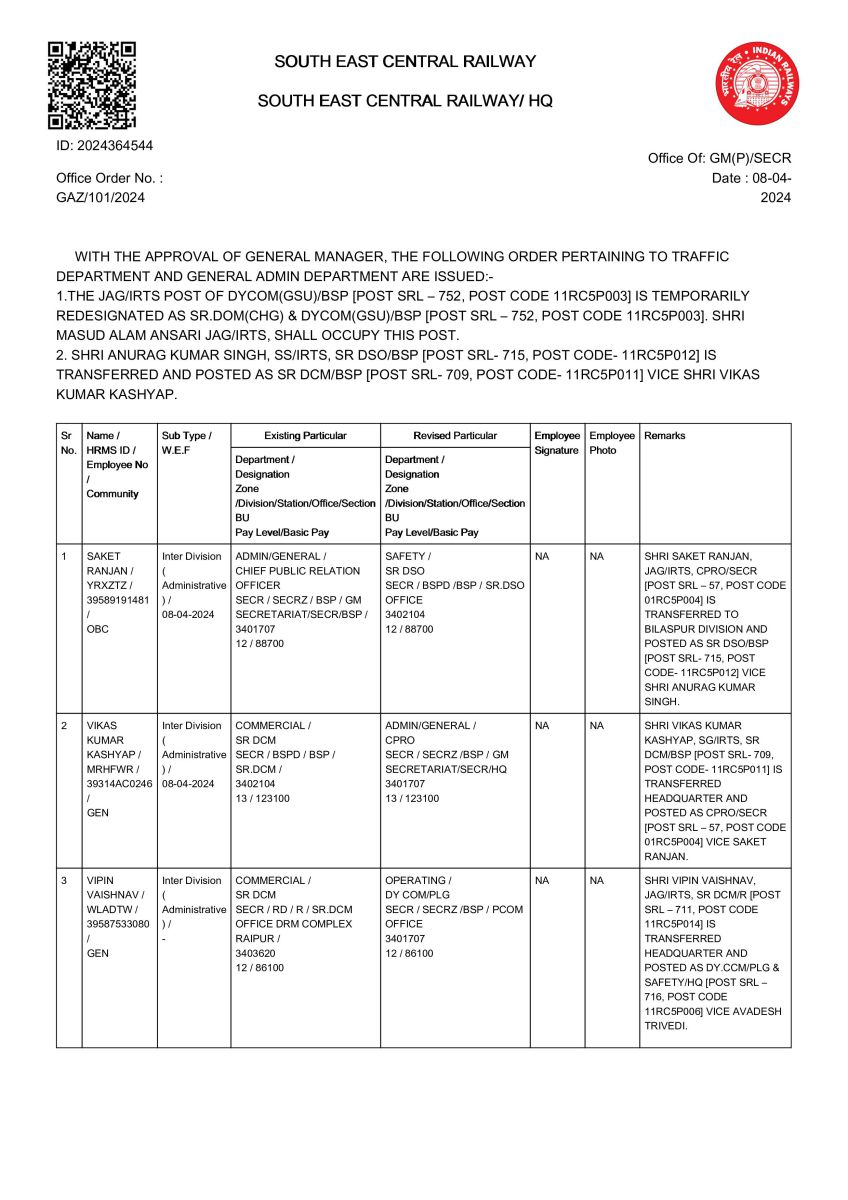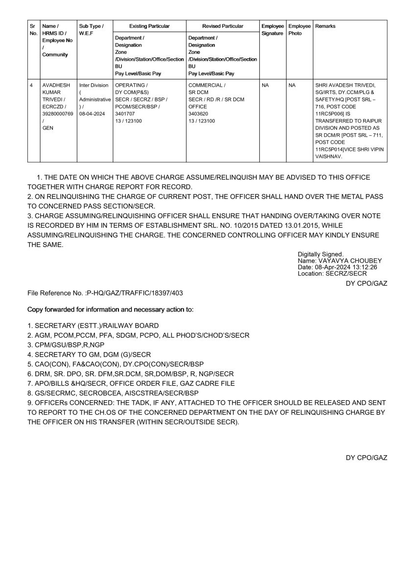 छत्तीसगढ़ Breaking News: दक्षिण पूर्व मध्य रेलवे के जोन अधिकारियों का हुआ ट्रांसफर, अवधेश कुमार त्रिवेदी बने नए DCM manseechandrakar 08 Apr 2024 14:54 PM