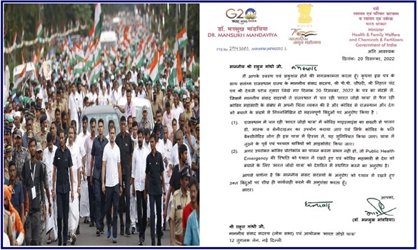 • Bharat Jodo Yatra: केंद्र सरकार की अपील : राहुल कोरोना के बढ़ते संक्रमण देख यात्रा रोक दें,  कांग्रेस का बयान : क्या गुजरात दौरे पर मोदी मास्क लगाए थे...?