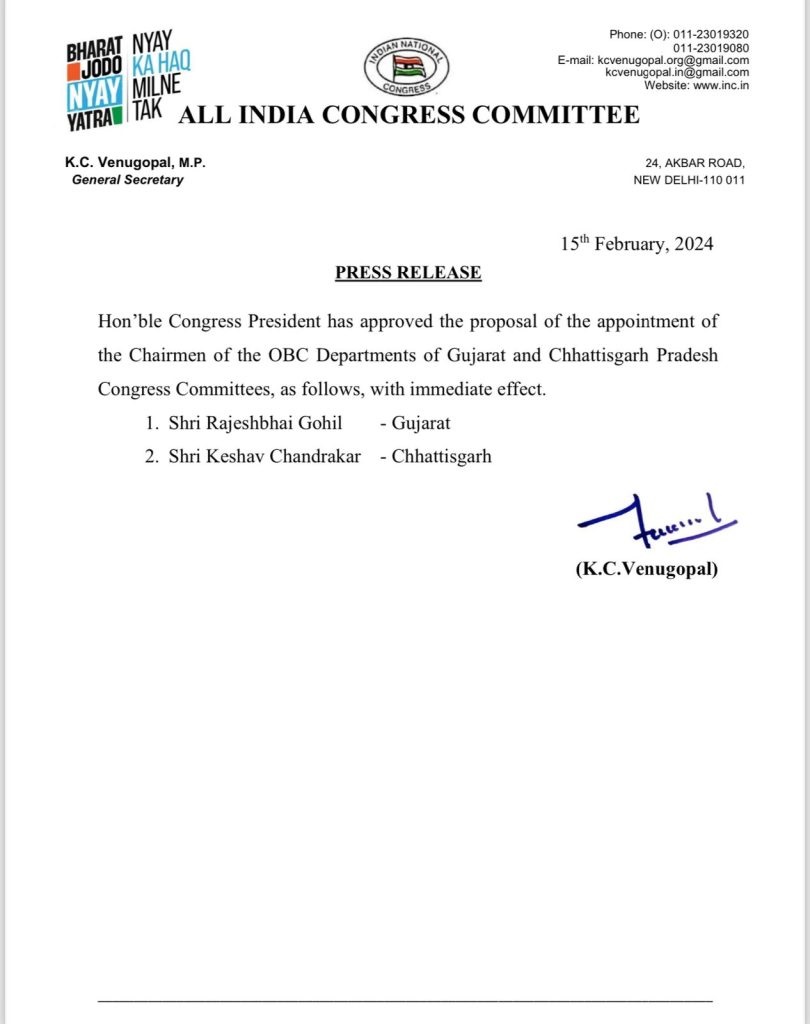 रायपुर। लोकसभा चुनाव के लिए सभी राजनीतिक पार्टियां अपनी तैयारियां तेज कर दी हैं तो वहीं प्रदेश में पिछड़ा वर्ग प्रकोष्ठ के लिए अध्यक्ष पद का चुनाव कर लिया गया है। कांग्रेस पार्टी के राष्ट्रीयअध्यक्ष मल्लिकार्जुन खड़गे ने केशव चंद्राकर को छत्तीसगढ़ प्रदेश कांग्रेस कमेटी के पिछड़ा वर्ग प्रकोष्ठ का अध्यक्ष नियुक्त किया है। इस संबंध में आदेश जारी कर दिया है। वहीं इसके अलावा राजेशभाई गोहिल को गुजरात कांग्रेस कमेटी का अध्यक्ष बनाया गया है।