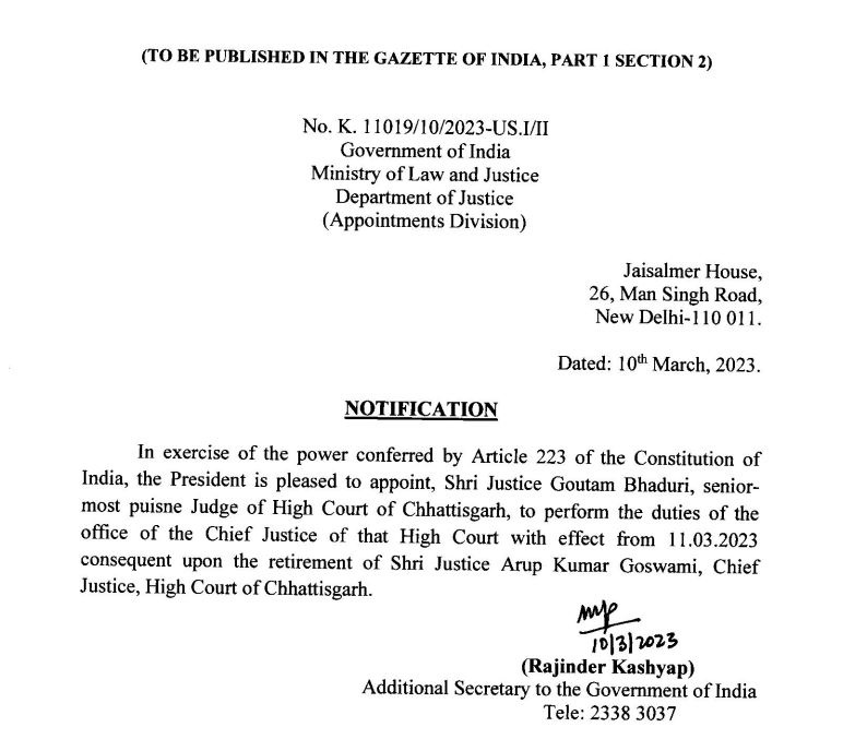 इस संबंध में अधिसूचना जारी करते हुए कहा गया है कि " भारत के संविधान के अनुच्छेद 223 द्वारा प्रदत्त शक्तियों के प्रयोग करते हुए राष्ट्रपति ने छत्तीसगढ़ के मुख्य न्यायाधीश के कार्यालय के कर्तव्यों का पालन करने के लिए वरिष्ठतम न्यायालय के न्यायाधीश जस्टिस गौतम भादुड़ी को नियुक्त किया है। यह नियुक्ति 11 मार्च से प्रभावी होगी.