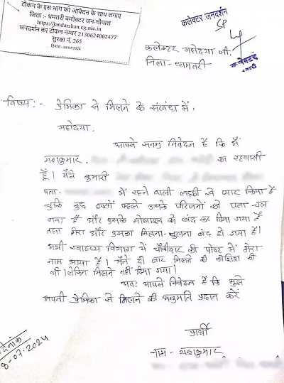 रायपुर। छत्तीसगढ़ के धमतरी जिले में हो रहे जनदर्शन में एक युवक ने अपनी प्रेमिका से मिलने की जिद्द लिये आवेदन लेकर कलेक्टर के पास पहुंच गया। बताया जा रहा है कि, कलेक्टर नम्रता गांधी ने जब उसका आवेदन पढ़ा तो वह भी हैरान हो गई।