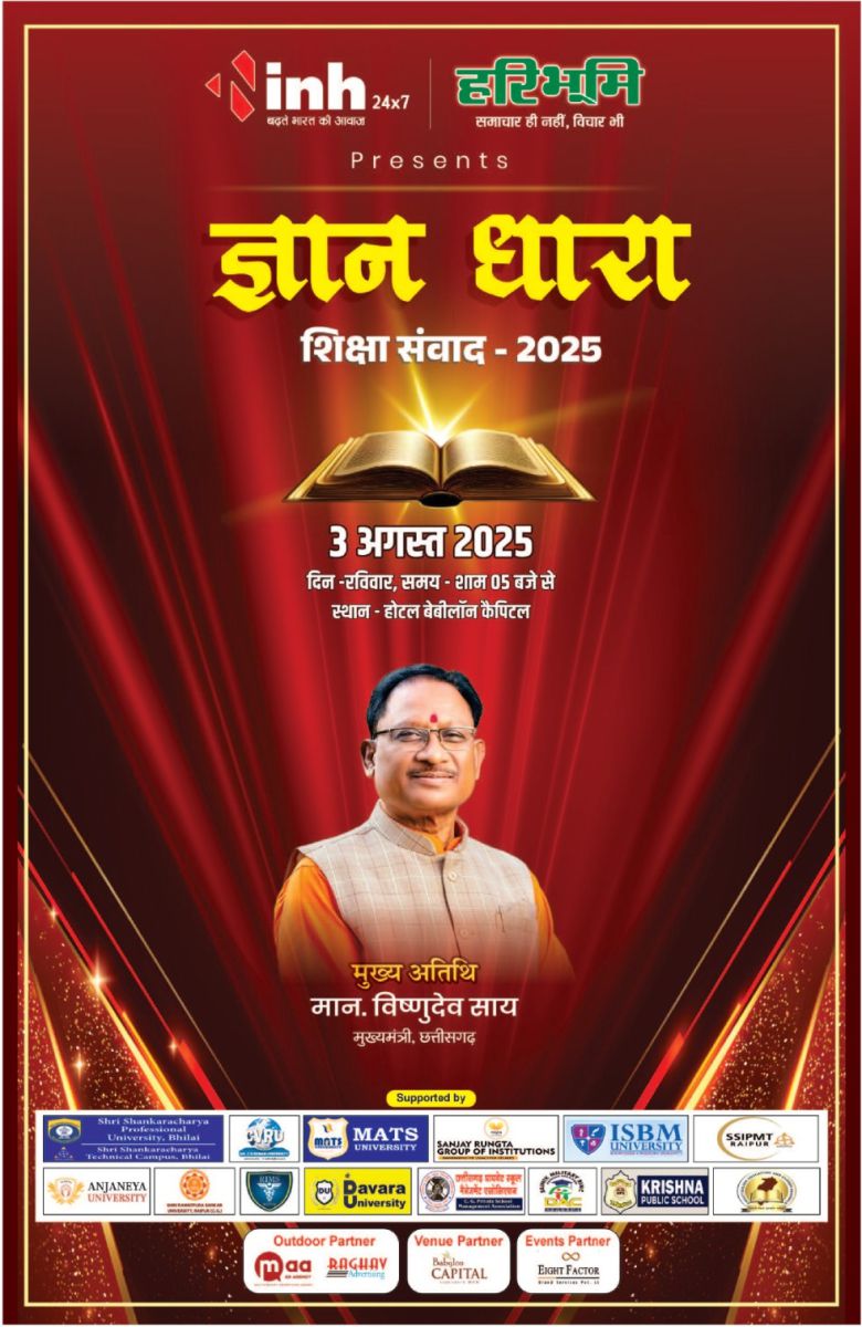 रायपुर। शिक्षा के क्षेत्र में नवाचार और संवाद को बढ़ावा देने के उद्देश्य से INH 24x7 और हरिभूमि के संयुक्त तत्वावधान में "ज्ञान धारा – शिक्षा संवाद 2025" का भव्य आयोजन किया जा रहा है। यह कार्यक्रम आगामी 3 अगस्त 2025, रविवार को शाम 5 बजे से होटल बेबीलोन कैपिटल, रायपुर में संपन्न होगा।