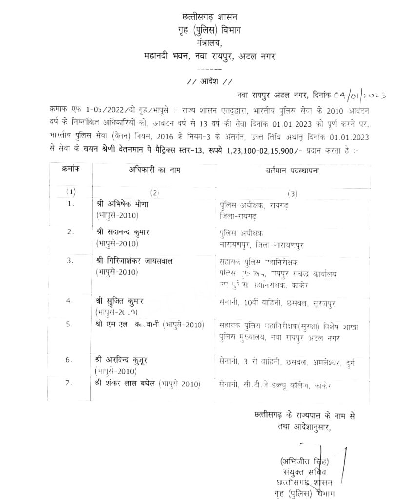इनके साथ ही 2009 बैच के अमित कांबले, प्रखर पांडेय, मनीष शर्मा, डी रविशंकर डीआईजी प्रमोट हुए हैं। 2010 बैच के अभिषेक मीणा, सदानंद कुमार और गिरीजाशंकर जायसवाल को सलेशन ग्रेड मिला है।