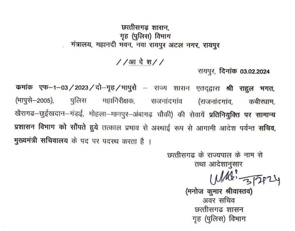 रायपुर। भारतीय पुलिस सेवा के राहुल भगत को मुख्यमंत्री विष्णु देव साय का सचिव नियुक्त किया गया है. सामान्य प्रशासन विभाग ने इसका आदेश जारी कर दिया है. बता दें कि, 2005 बैच के IPS राहुल भगत राजनांदगांव रेंज के आईजी पद पर हैं. वे झारखंड के रहने वाले हैं.