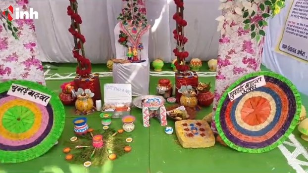 मंडप के नीचे विवाह में लगने वाले सभी सामग्रियों को सजा कर रखा गया है। एवम विवाह मंडप को आम के पत्तो एवम फूलो से सजाया गया है। स्व सहायता समूह की महिला बहनों को द्वारा शादी मड़वा को तैयार किया गया है जिसमें जिला प्रशासन का भी काफी सहयोग रहा है।