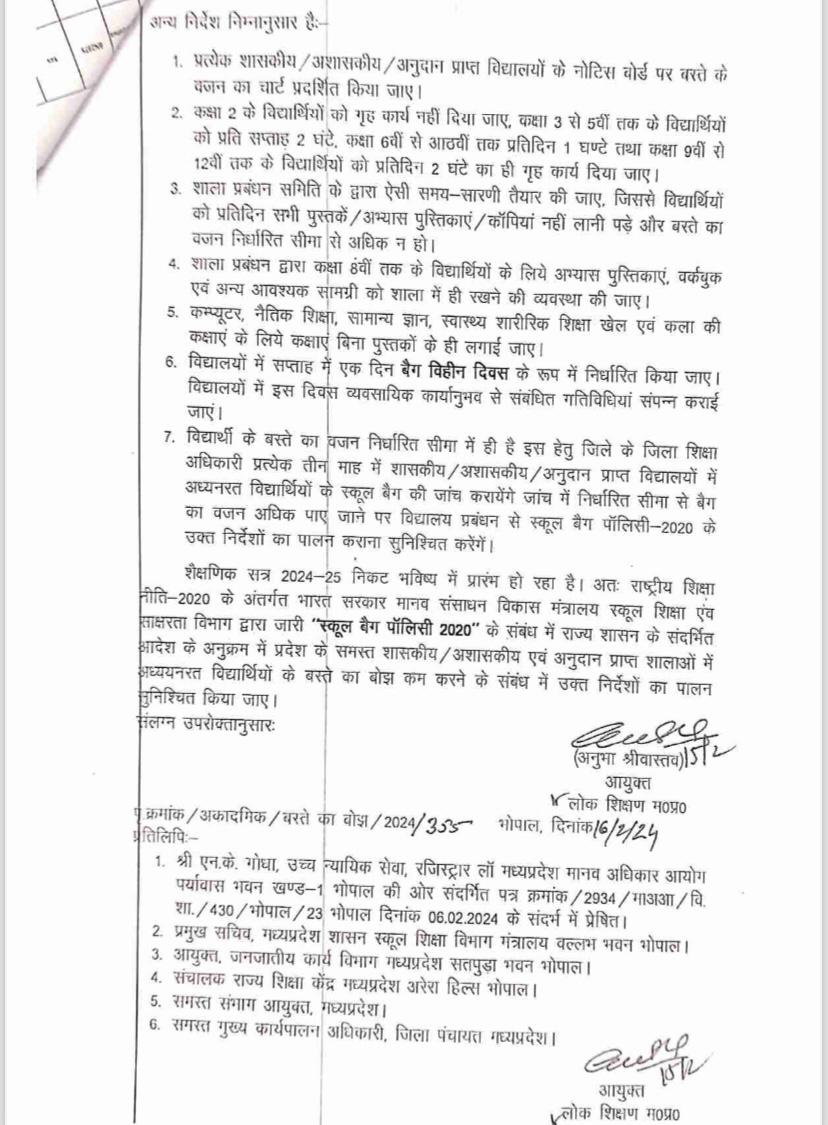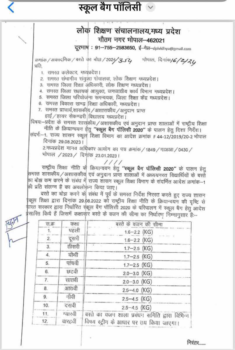 असल में स्कूल शिक्षा विभाग द्वारा एक बैग पॉलिसी जारी की गई है। जिसमें स्कूली बच्चों को लिए खास सौगात जैसा काम किया गया है। विभाग द्वारा एक ऐसा दिन निर्धारित किए जाने के आदेश जारी हुए हैं जिस दिन किसी भी बच्चे को बैग लेके नहीं जाना होगा। इस नो बैग डे पर सभी बिना बैग लिए ही स्कूल जाएंगे। वही विभाग द्वारा ये भी कहा गया है कि दूसरी कक्षा तक के बच्चों के लिए होमवर्क नहीं दिया जाएगा। विभाग द्वारा पहली से 12 वीं तक के बच्चों के लिए वजन की सीमा भी तय की गई है। स्कूल शिक्षा विभाग द्वारा जारी किया गया ये नियम प्रदेश के सभी शासकीय अशासकीय और अनुदान प्राप्त स्कूलों में लागू होगा।