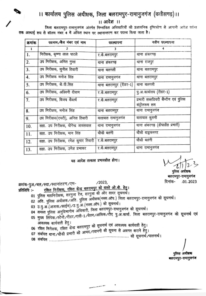 Police Transfer: छत्तीसगढ़ के न्यायधानी बलरामपुर में बड़ी संख्या में पुलिसकर्मियों का ट्रान्सफर हुआ है. जिसमें 1 TI(टाउन इंस्पेक्टर), 8 SI(उप निरीक्षक) , 4 ASI (असिस्टेंट सब-इंस्पेक्टर) का एक साथ तबादला कर दिया गया है. देखें आदेश...