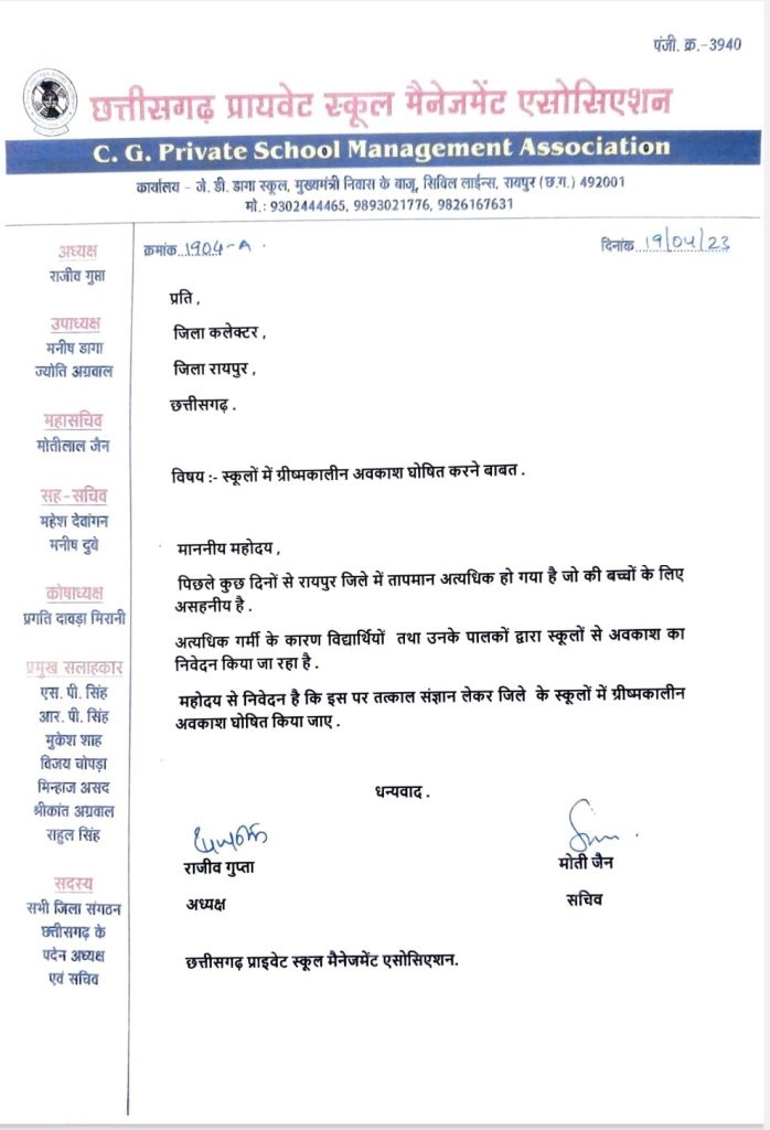 छत्तीसगढ़ प्राइवेट स्कूल मैनेजमेंट एसोसिएशन ने पहले रायपुर कलेक्टर सर्वेश्वर भुरे को पत्र लिखकर गर्मी की छुट्टी की मांग की थी. उन्होंने पत्र में कहा था कि गर्मी बढ़ गई है, बच्चों को तकलीफें हो रही है, ऐसे में गर्मी छुट्टी की मांग की जा रही है.