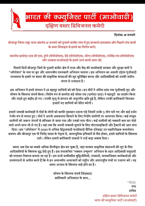 बीजापुर। छत्तीसगढ़ के बीजापुर और सुकमा की सीमा पर सुरक्षाबलों ने कल एक बड़ा आपरेशन चलाते हुए कई नक्सलियों को ढेर किया था। मुठभेड़ के बाद बस्तर आईजी पी सुंदरराज, DIG दंतेवाड़ा कमलोचन कश्यप, बीजापुर SP जितेंद्र यादव, दंतेवाड़ा SP गौरव रॉय और सुकमा SP किरण चौहाण ने संयुक्त प्रेसवार्ता लेते हुए जानकारी दी थी की आपरेशन में जवानों ने 12 नक्सलियों को मार गिराया है जिनके शव बरामद किये गए थे लेकिन आज नक्सलियों के दक्षिण बस्तर डिविजनल कमेटी की सचिव ने प्रेसनोट जारी किया है। इस प्रेसनोट में 18 माओवादियों के मारे जाने की जानकारी दी गई है।