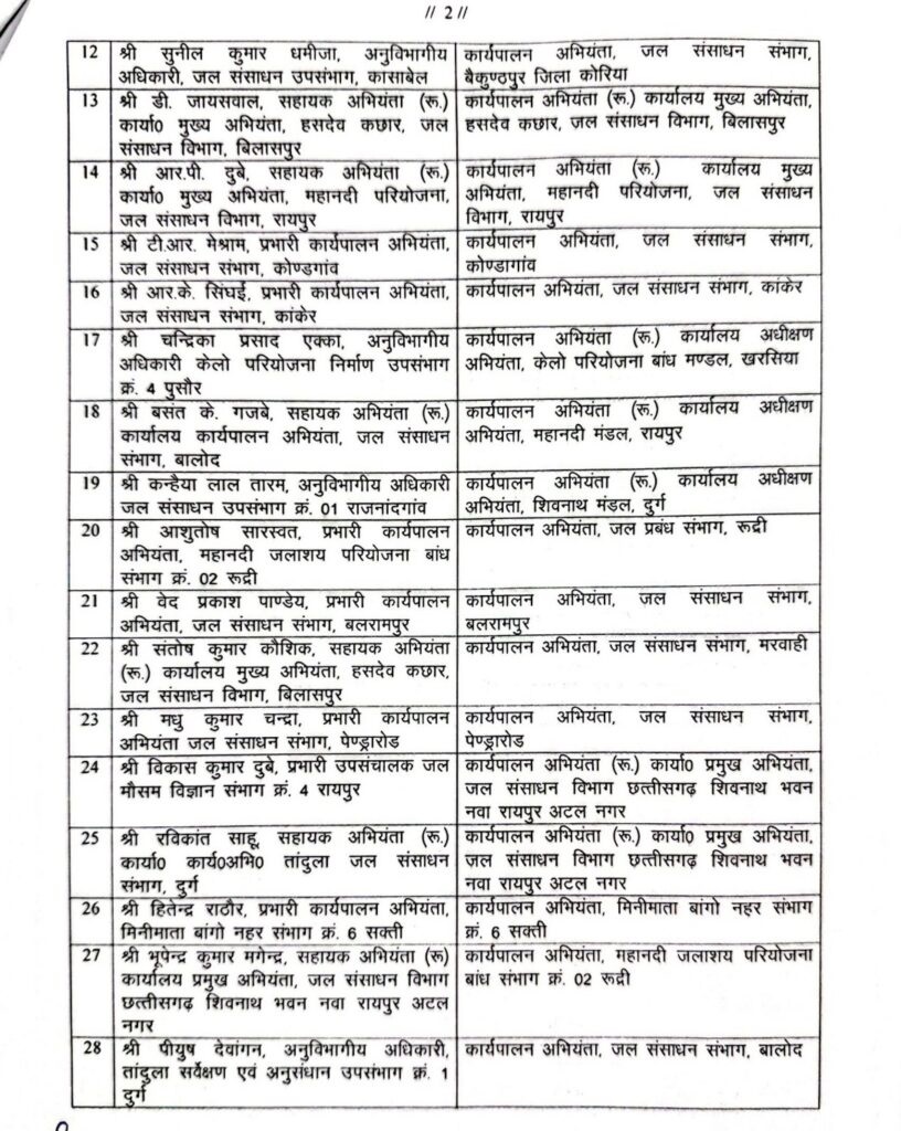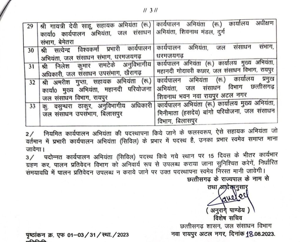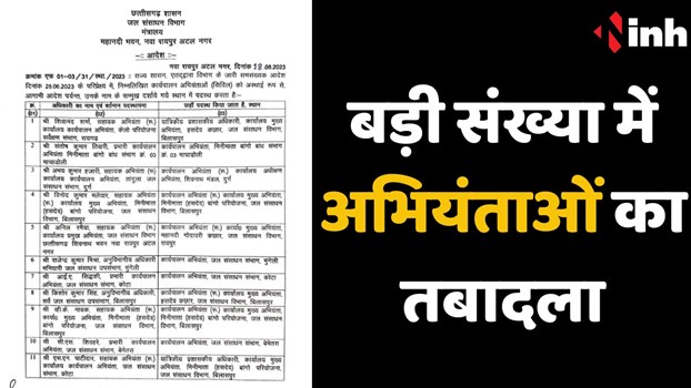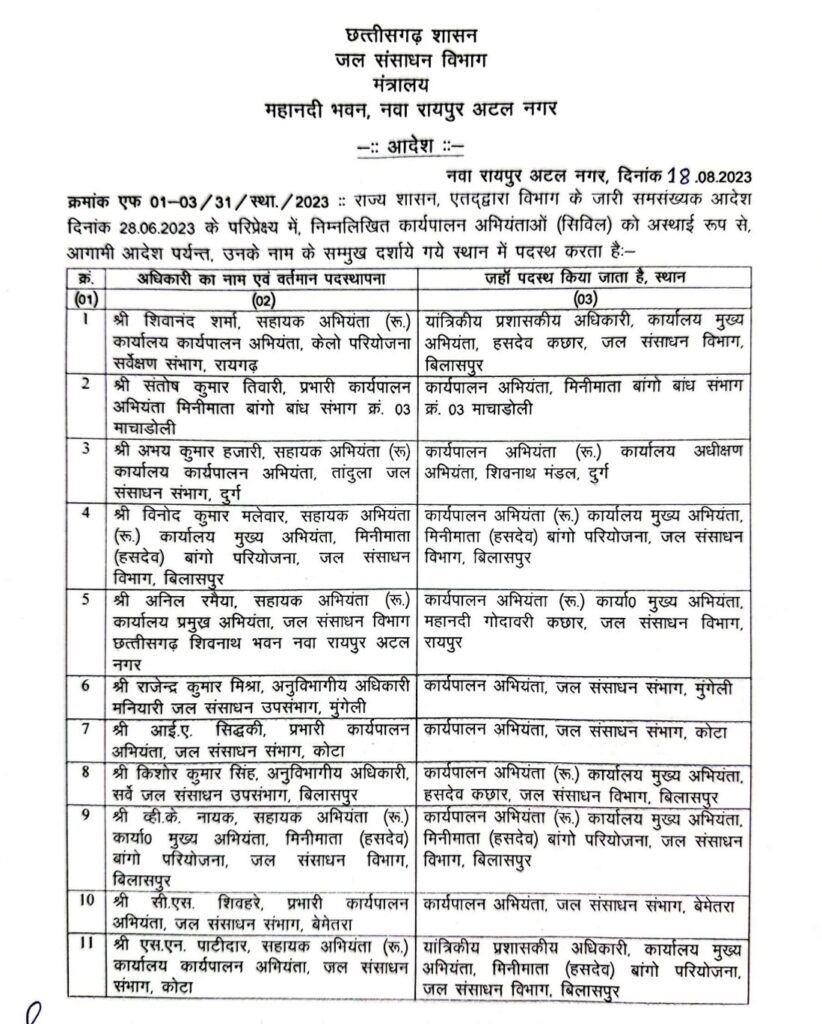 TRANSFER BREAKING: राज्य शासन द्वारा जल संसाधन विभाग में पदस्थ कार्यपालन अभियंताओं (CIVIL) की तबादला सूची जारी की गई है। इस आदेश के साथ ही इस बात का भी उल्लेख है कि संबंधित कार्यालय में जो प्रभारी कार्यपालन अभियंता पदस्थ हैं, उनका प्रभार स्वमेव समाप्त माना जायेगा।