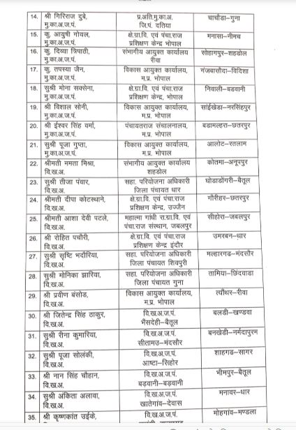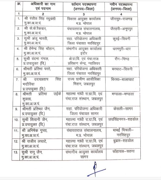 भोपाल : मध्य प्रदेश में इन दिनों तबादलें का दौर जारी है। पुलिस विभाग के बाद मध्य प्रदेश में जनपद पंचायत के 35 सीईओ का तबादला किया गया है। जिसको लेकर देर रात आदेश भी जारी कर दिया गया है। आदेश के तहत भोपाल, ग्वालियर जबलपुर जैसे शहरी कार्यलयों में पदस्थ CEO अफसरों को ग्रामीण इलाकों में भेजा गया है।