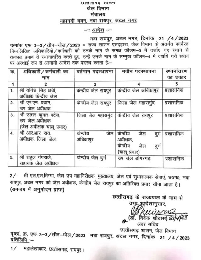 Transfer Order: छत्तीसगढ़ में ट्रांसफर प्रमोशन का काम है जिसमें प्रदेश सरकार ने सेन्ट्रल जेल के अधीक्षकों उप जेल अधीक्षक का तबादला किया है. जिसमें रायपुर सेंट्रल जेल के अधीक्षक योगेश सिंह क्षत्री और उप जेल अधीक्षक एमएन प्रधान का हटा दिया है. योगेश सिंह क्षत्री का तबादला सेंट्रल जेल अंबिकापुर और एमएन प्रधान का तबादला महासमुंद किया गया है. इसके अलावा अन्य जिलों के अधीक्षकों का भी तबादला किया गया है.