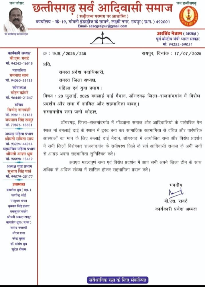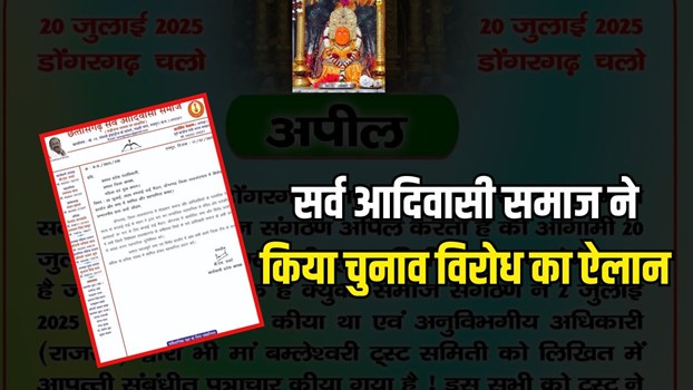 सर्व आदिवासी समाज ने 20 जुलाई को डोंगरगढ़ के बमलेश्वरी मैदान में विरोध सभा और विशेष प्रदर्शन आयोजित करने की घोषणा की है। इसके माध्यम से समाज न्याय संगत प्रक्रिया की मांग करेगा और यह सुनिश्चित करने का प्रयास करेगा कि मां बमलेश्वरी ट्रस्ट का संचालन संविधानिक और पारदर्शी प्रक्रिया से हो,